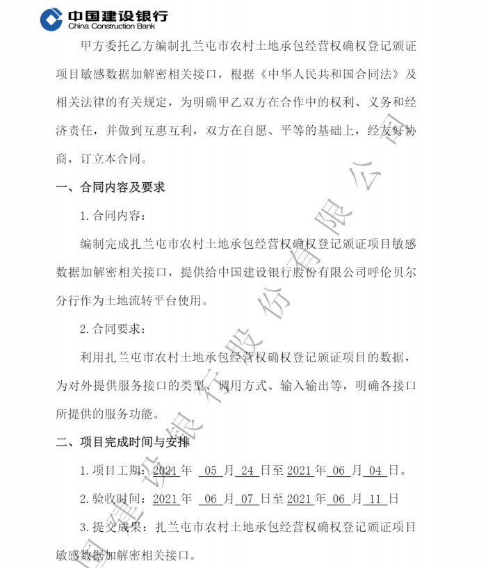 > 本系统项目初始来源是扎兰屯土地流转项目(软件),用于对接银行接口,中国建设银行用于抵押贷款使用。后来于2024年6月为申报职称用,申请著作权,又在银行(软件)源代码上进行了改进。增加VUE前端代码,改进了数据库结构,同时又增加了必要的API接口。形成了现在你看到的V1.0版本。